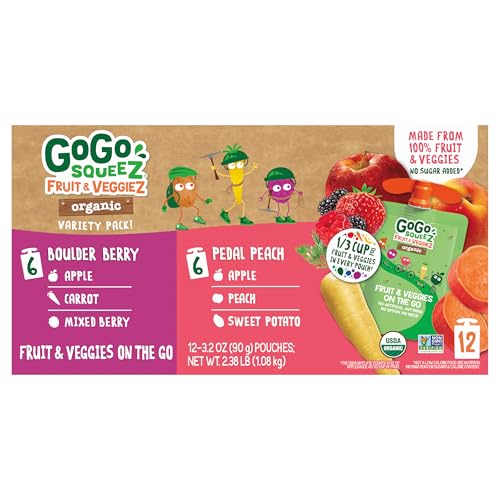 Specification: GoGo squeeZ No Sugar Added Organic Fruit & veggieZ Applesauce and Puree Variety Pack, Pedal Peach and Boulder Berry, 3.2 oz Pouches (Pack of 12), Fruit Snacks for Kids, Gluten Free, Nut Free, Recloseable Cap, BPA Free