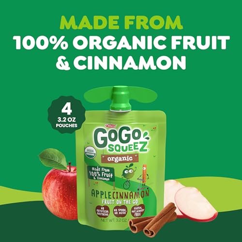 GoGo squeeZ Organic Applesauce and Fruit Puree, Apple Cinnamon, 3.2 oz (Pack of 4), Unsweetened Organic Fruit Snacks for Kids, Gluten Free, Nut Free and Dairy Free, Recloseable Cap, BPA Free Pouches