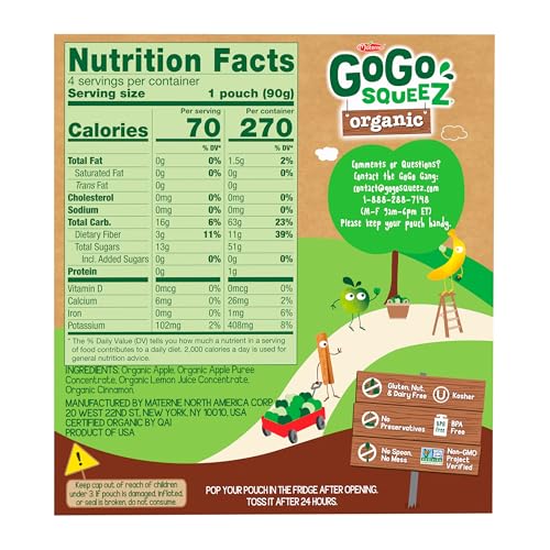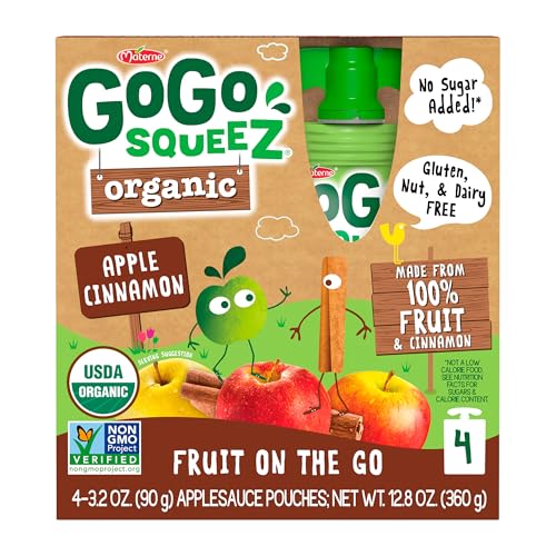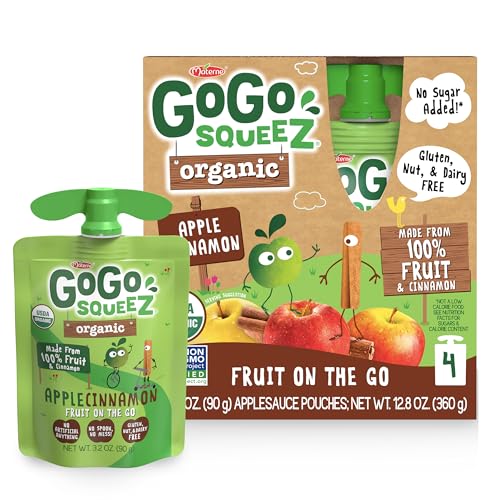 Specification: GoGo squeeZ Organic Applesauce and Fruit Puree, Apple Cinnamon, 3.2 oz (Pack of 4), Unsweetened Organic Fruit Snacks for Kids, Gluten Free, Nut Free and Dairy Free, Recloseable Cap, BPA Free Pouches