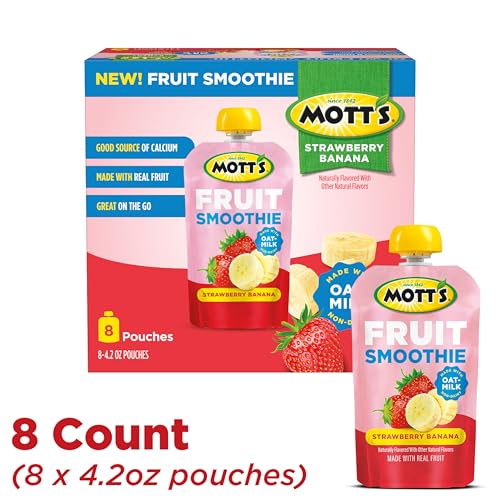 Mott’s Fruit Smoothies Strawberry Banana, 4.2 oz clear pouches, 8 Pack, Non-dairy, Made With Oatmilk, Made With Real Fruit, Good Source of Calcium, On-the-Go
