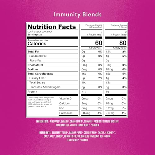 Specification: Once Upon a Farm Organic Immunity Blend Pineapple, Banana & Dragon Fruit and Blueberry, Banana, & Ginger Pouch Multipack, 4-3.2oz