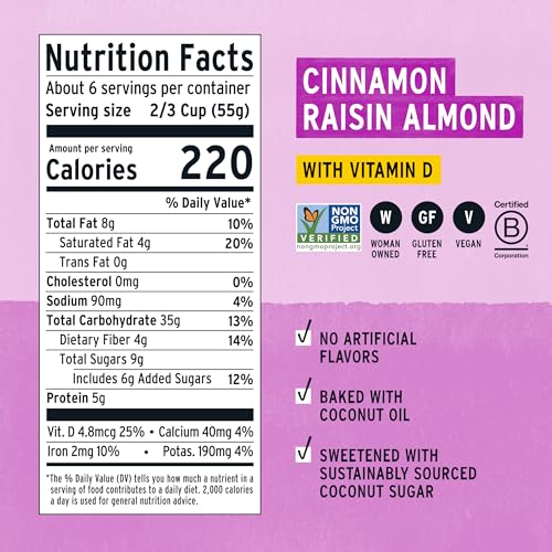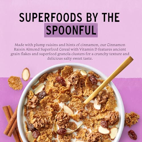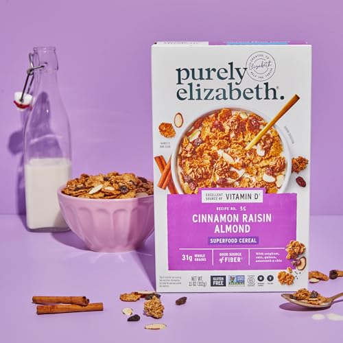 Purely Elizabeth Cinnamon Raisin Almond Superfood Cereal with Vitamin D combines plump raisins and hints of cinnamon with ancient grain flakes and superfood granola clusters for a crunchy texture and delicious salty sweet taste. Intentionally crafted with whole food ingredients you can see and taste, our gluten free, vegan cereal recipe combines sorghum, oats, chia, amaranth and quinoa. Each serving provides an excellent source of Vitamin D as well as a good source of fiber and whole grains. Enjoy Purely Elizabeth cereal with milk, fresh fruit, or yogurt or for a delicious breakfast, snack or dessert.