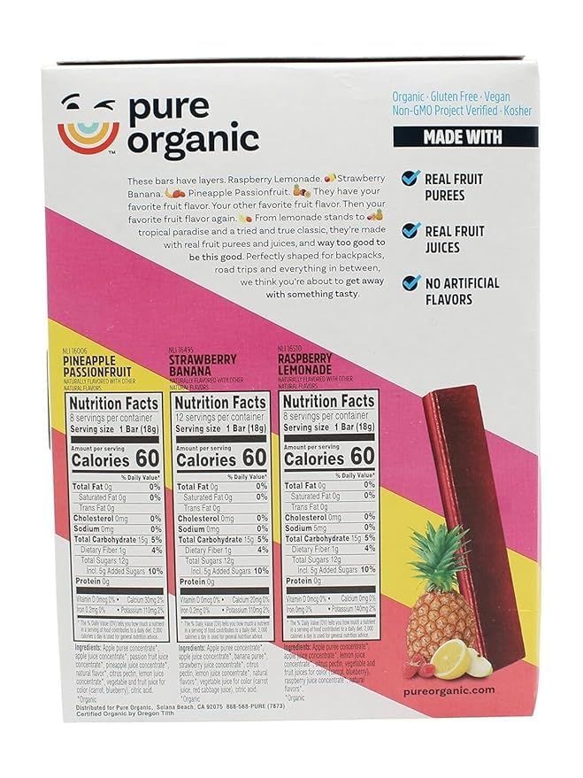 Specification: Generic Pure Organic: Layered Fruit Bars 3 Variety Pack ~ Raspberry Lemonade ~ Strawberry Banana ~ Pineapple Passionfruit ~ Pack of 1