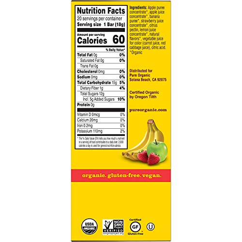 Specification: Pure Organic, Layered Fruit Bars, Strawberry Banana, Gluten Free and Vegan Fruit Snacks, 12.6oz Box (20 Count)