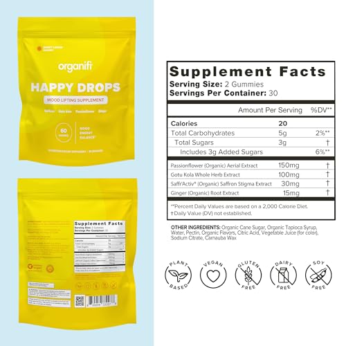 Specification: Organifi Happy Drops – Daily Superfood Happy Gummies for Adults – Mood Support Supplement for Balance, Bliss, Energy and Taking the Edge Off – Sweet Lemon Flavor – 60 Gummies