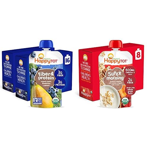Specification: Happy Tot Organics Stage 4 Fiber & Protein, Pears, Blueberries & Spinach (Pack of 16) & Super Morning Stage 4, Apple Cinnamon, Yogurt, Oats + Super Chia (Pack of 8)