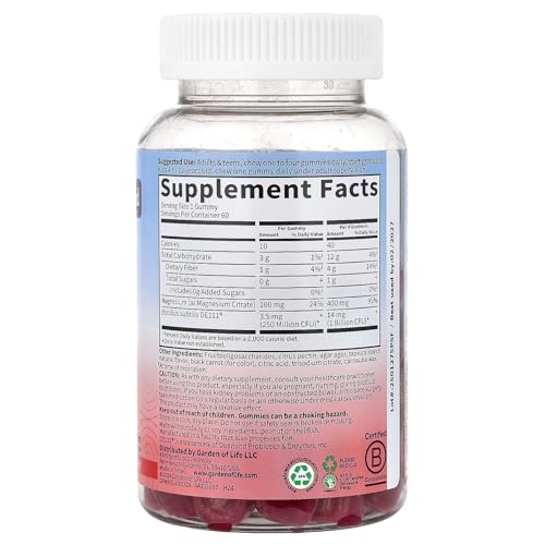 Specification: Garden of Life Magnesium Citrate Supplement Gummies with Prebiotics & Probiotics for Stress, Sleep & Recovery – Vegan, Gluten Free, Kosher, Non-GMO, No Added Sugars, Raspberry Flavor, 60 Count