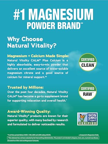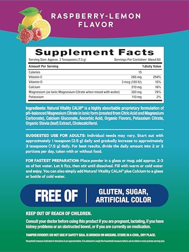Specification: Natural Vitality Calm, Magnesium & Calcium Supplement, Drink Mix Powder Supports a Healthy Response to Stress, Gluten Free, Vegan, & Non-GMO, Raspberry Lemon, 16 oz