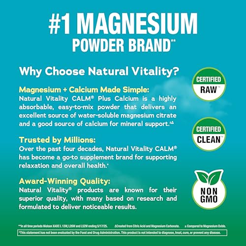 Natural Vitality CALM Magnesium Supplement Drink Mix Plus Calcium contains a unique calcium magnesium blend that gives you the calcium you need with the calm you want, all in a convenient powder drink mix. With 350 mg of magnesium per serving, this drink mix replenishes depleted magnesium levels to help you feel relaxed and calm (1). Formulated with magnesium carbonate and citric acid, Natural CALM magnesium powder combines with water to create a magnesium citrate solution, which is better absorbed than magnesium oxide (1). This liquid magnesium is also combined with calciuman important nutrient essential for maintaining total body healthnot just to keep your bones and teeth strong, but to ensure proper functioning of muscles and nerves (1). These vegetarian, gluten-free, raspberry lemon-flavored supplements contain no sugar or artificial flavor or color. Simply mix this powder drink mix with water for a delicious beverage you can enjoy any time. (1) These statements have not been evaluated by the Food and Drug Administration. This product is not intended to diagnose, treat, cure or prevent any disease.