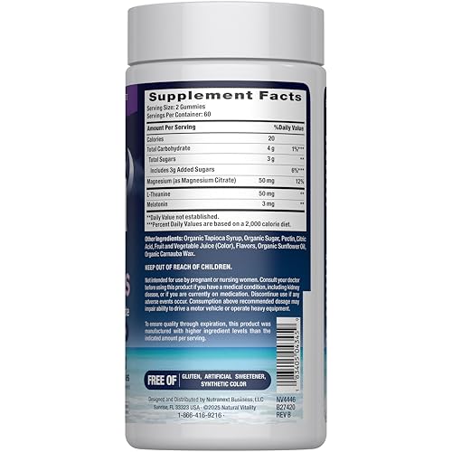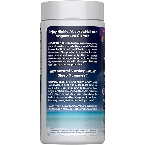 Specification: Natural Vitality SLEEP Gummies, Magnesium Supplement With Melatonin and L-Theanine, Vegan, Gluten Free, Helps the Body Ease Into Sleep, Blueberry Pomegranate 120 Count