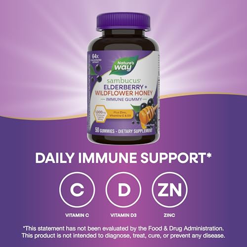 Specification: Nature’s Way Sambucus Elderberry + Wildflower Honey Immune Gummy, Daily Immune Support for Adults and Kids Ages 4+*, Vitamins C & D3, Zinc, Vegetarian, 50 Gummies