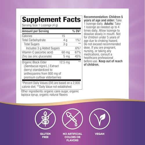 Standardized extract made with our unique black elderberry extract from black elderberries grown in select locations across Europe triple-action blend each lozenge provides 12.5 mg of black elderberry extract plus zinc (5 mg) and and vitamin C (60 certified organic delicious flavor sweetened with organic tapioca syrup and organic cane sugar no artificial preservatives, flavors or colors.