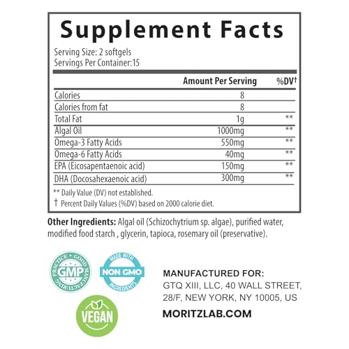 Specification: DR. MORITZ Vegan Omega-3 Softgels for Adults and Kids, Made from Algae Oil with DHA EPA, Small Algae Omega 3 Supplements, Vegan, 30 Count