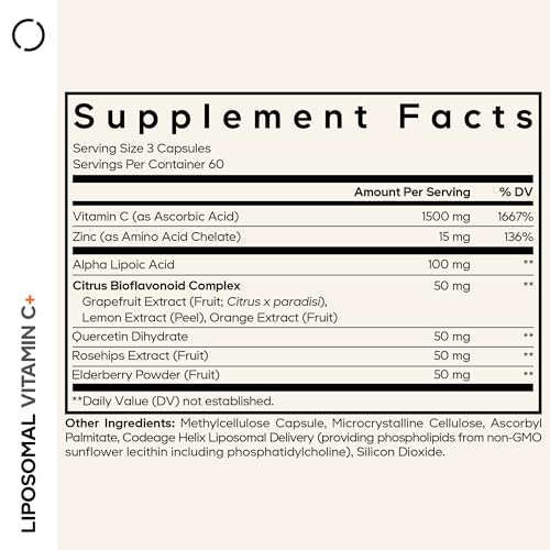 Specification: Codeage Liposomal Vitamin C 1500mg with Zinc, Elderberry, Citrus Bioflavonoids Grapefruit, Lemon, Orange Powder, Quercetin & Rose Hips Fruit – Vegan Supplement – Non-GMO, Vegan Pills, 180 Capsules