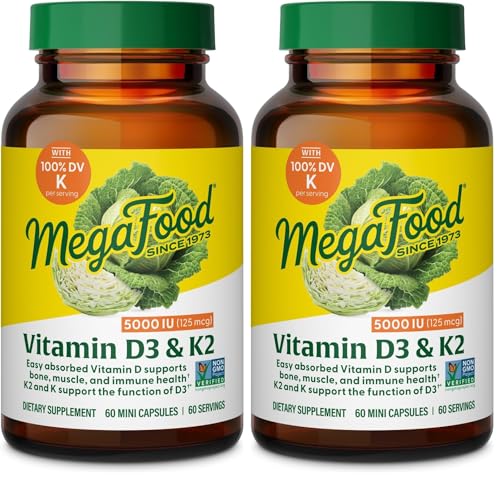 MegaFood Vitamin D3 5000 IU (125 mcg) – Vegetarian Supplements with Vitamin D3 K2 – Supports Bones, Teeth, Muscles & Immune Health – Certified Non-GMO – 60 Mini Capsules, 60 Servings (Pack of 2)
